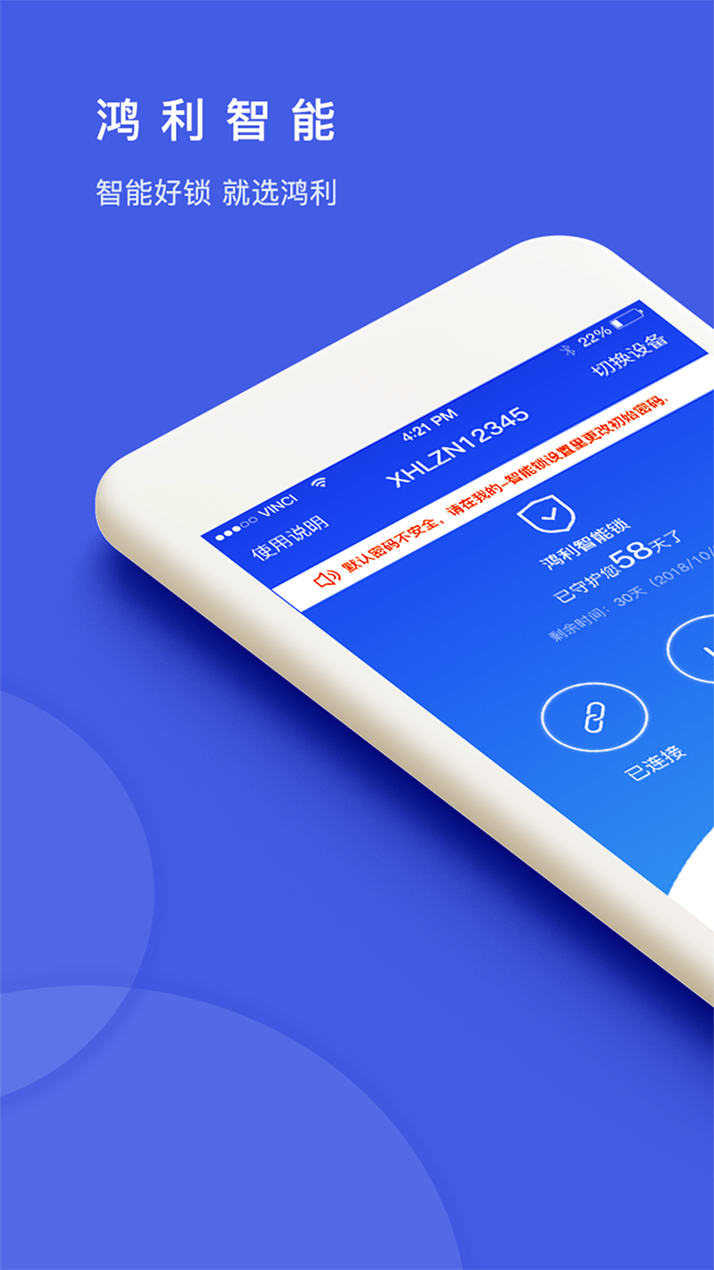 鸿利智能APP,主要为正在使用“鸿利智能锁”的所有用户提供着全方位服务的一款产品。用户可以使用APP对锁具进行开门密码,指纹,ID卡,管理密码,设置更改功能,同时也可以使用蓝牙进行APP开门。